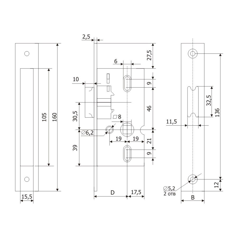 | Расстояние от торцевой планки до центра отверстия под ручку D (Backset) | 25 мм / 35 мм |