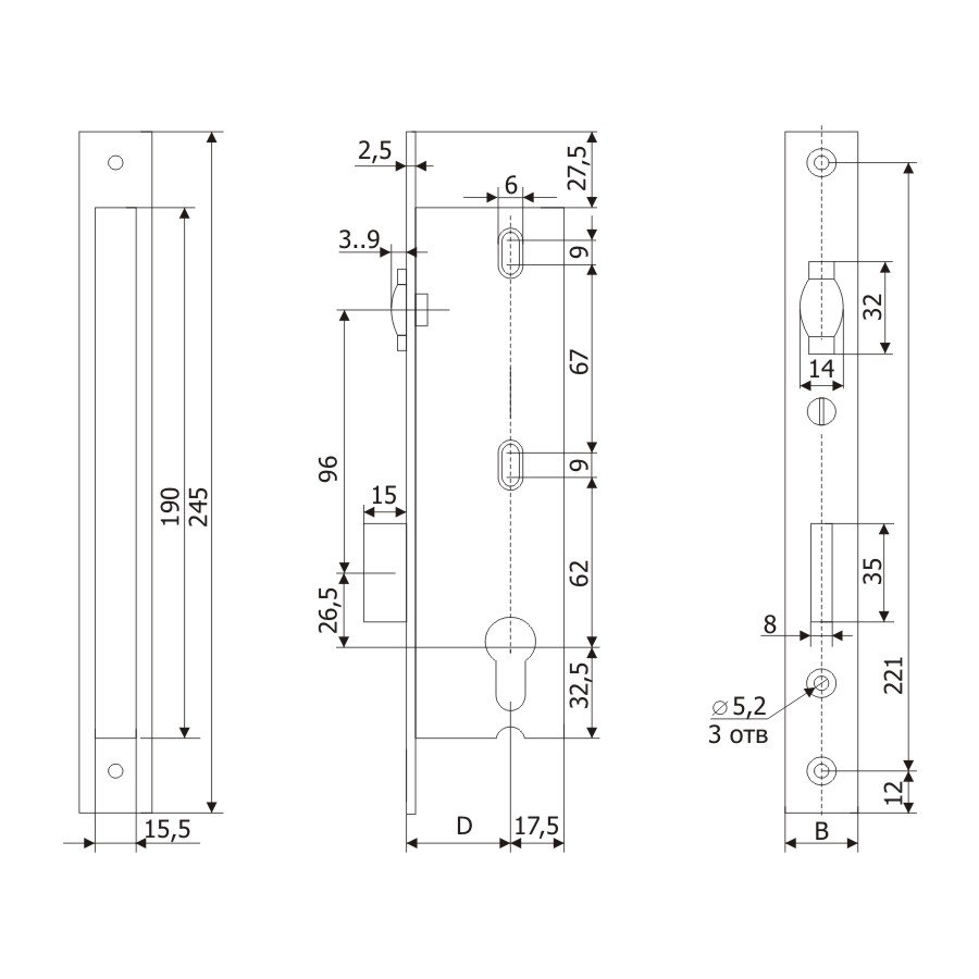 | Расстояние от торцевой планки до центра отверстия под ручку D (Backset) | 25 мм / 30 мм / 35 мм / 45 мм |
