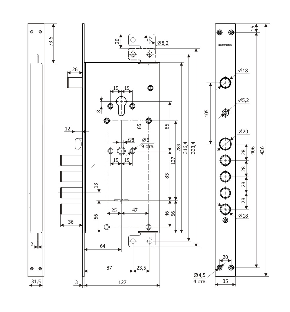 | Вылет ригелей | 36 мм |